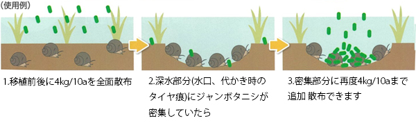 ●スクミンベイト3はジャンボタニシへの高い誘引性がありますが、水田全体に均一に散布するとより効果が発揮されます。