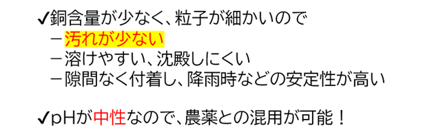 - 適用作物が広い(無機銅⇒使用回数制限なし)